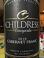 Comments: It should be noted that this Childress Cabernet Franc received a Gold Award at the 2013 North Carolina State Fair Wine Competition.